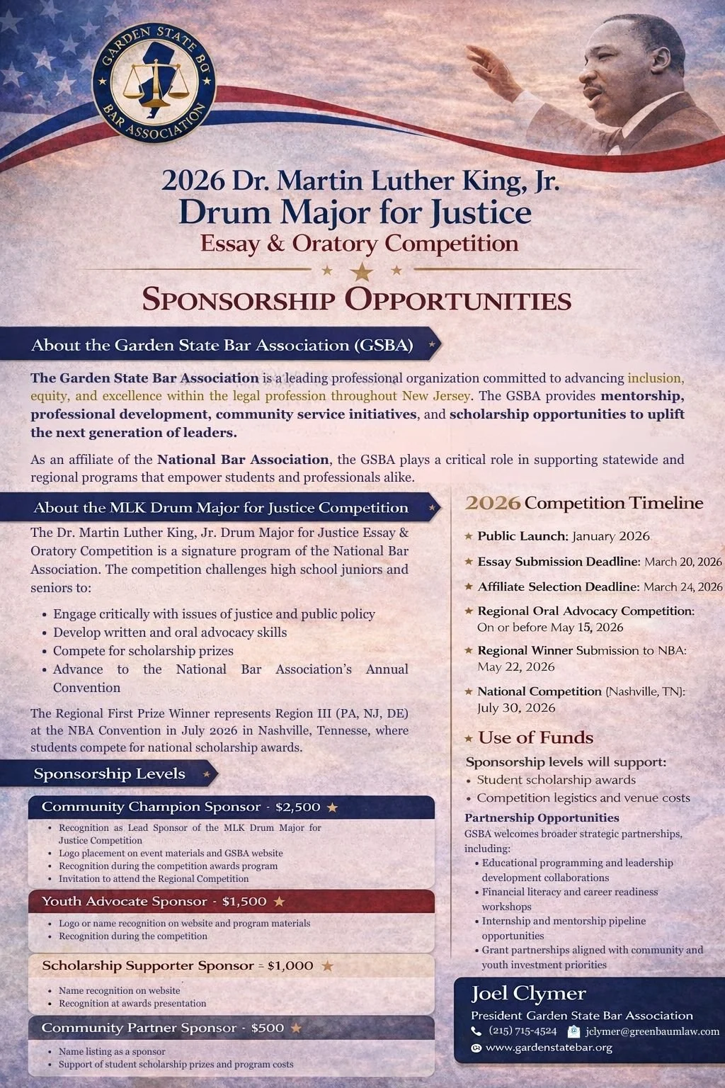 The GSBA and the ABLW-NJ are proud to host the 2026 Dr. Martin Luther King, Jr. Drum Major for Justice Advocacy Competition for high school students across New Jersey.